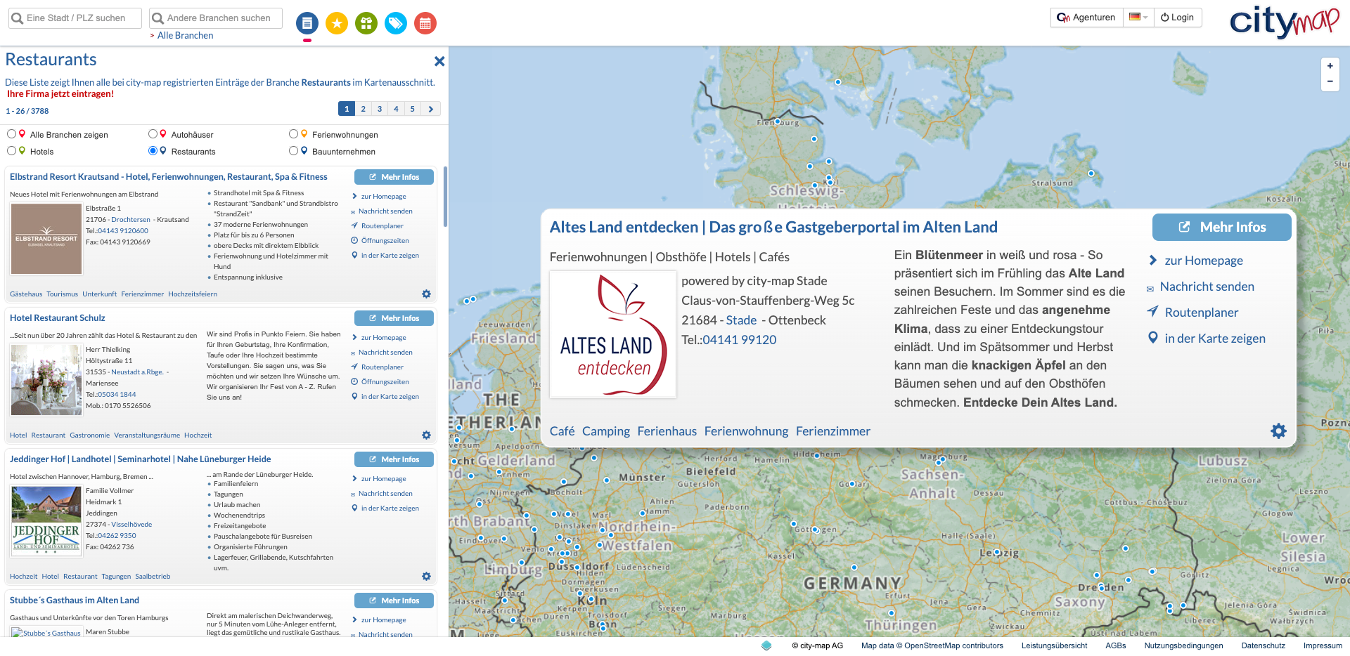 Die city-map Verzeichnisse und die businessCARD werden in den Suchergebnissen von Google und anderen Suchmaschinen angezeigt, wenn potenzielle Kunden nach Unternehmen regional suchen.
